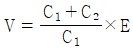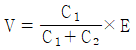 정전유도를 받고 있는 접지되어 있지 않는 도전성 물체에 접촉한 경우 전격을 당하게 되는데 이 때 물체에 유도된 전압 V(V)를 옳게 나타낸 것은? (단, E는 송전선의 대지전압, C1은 송전선과 물체사이의 정전용량, C2는 물체와 대지사이의 정전용량이며, 물체와 대지사이의 저항은 무시한다.)