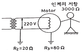 아래 그림과 같이 인체가 전기설비의 외함에 접촉하였을 때 누전사고가 발생하였다. 인체통과전류(mA)는 약 얼마인가?