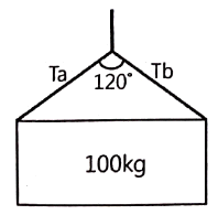 질량이 100kg인 물체를 그림과 같이 길이가 같은 2개의 와이어로프로 매달아 옮기고자 할 때 와이어로프 Ta에 걸리는 장력은 약 몇 N인가?