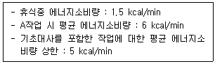 A작업의 평균에너지소비량이 다음과 같을 때, 60분간의 총 작업시간 내에 포함되어야 하는 휴식시간(분)은?