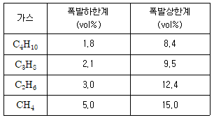 다음 [표]를 참조하여 메탄 70vol%, 프로판 21vol%, 부탄 9vol%인 혼합가스의 폭발범위를 구하면 약 몇 vol%인가?