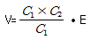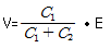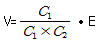 정전유도를 받고 있는 접지되어 있지 않는 도전성 물체에 접촉한 경우 전격을 당하게 되는데 이 때 물체에 유도된 전압 V(V)를 옳게 나타낸 것은? (단, E는 송전선의 대지전압, C1은 송전선과 물체사이의 정전용량, C2는 물체와 대지사이의 정전용량이며, 물체와 대지사이의 저항은 무시한다.)