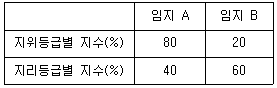 소나무림 임지 A가 ha당 4,000만 원에 거래되었고, 인접한 지역에 3ha의 소나무림 임지 B가 있다. 임지 A와 B에 대한 지위와 지리등급별 지수가 다음과 같을 때, 입지법에 의한 소나무림 임지 B의 임지매매가[만 원]는?