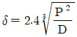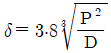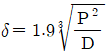 측정력에 의한 변형에서 헤르츠(Hretz)법칙에 의한 변형 중 구면과 평면일 경우 탄성변형량을 구하는 공식은 어느 것인가? (단, P는 측정력(kgf), D는 구면지름(mm), L은 평면의 길이(mm), δ는 변형 길이(㎛))