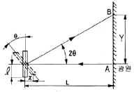 그림과 같은 광 지렛대에서 x = 1㎛의 변위를 Y = 0.1㎜로 확대하려면 광원 “A”와 반사경과의 거리 L은 얼마가 되는가? (단, ℓ= 5㎜이다.)(오류 신고가 접수된 문제입니다. 반드시 정답과 해설을 확인하시기 바랍니다.)