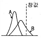 공작 기계 A, B로 가공한 부품의 지름을 측정한 결과 측정치의 분포가 그림과 같을 때 정도(精度)에 대한 설명으로 올바른 것은?