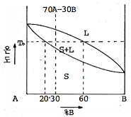 전율고용체형 상태도에서 70A - 30B합금을 냉각할 때 온도 To 에서 고체 S 의 양은 몇 % 인가?