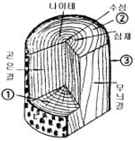 다음 그림은 목재의 조직을 도시한 것이다. ①,②,③의 명칭은?