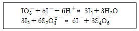 용존산소 적정용 0.025N Na2S2O3 표준용액의 표정을 할 때 KIO3는 다음과 같은 반응을한다. KIT3 1mole은 몇 eq인가?