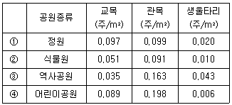 「조경설계기준(KDS 34 40 10:2024)」상 도시공원의 조성녹지면적을 기준으로 한 권장식재밀도를 바르게 연결한 것은?