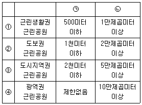 「도시공원 및 녹지 등에 관한 법률 시행규칙」상 근린공원의 ㉠유치거리와 ㉡규모를 바르게 연결한 것은? (단, 해당 법률의 예외규정을 적용하지 않음)