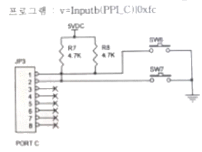 다음 회로에서 푸시버튼 스위치 SW6은 OFF, SW7은 ON 상태일 때의 이진수 8비트 표현 시 v값으로 옳은 것은? (단, 회로의 x표시는 리던던시, JP3의 1번 단자가 LSB이고 8번 단자가 MSB이다. 1은 OR의 기호이다.)