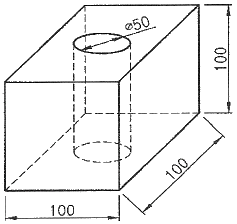 다음 그림과 같이 가로, 세로, 높이가 모두 100mm인 사각기둥에 직경이 50mm인 구멍이 윗면에서 밑면까지 수직으로 뚫려 있다면 사각기둥의 체적은 약 몇 mm3인가?