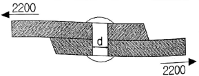 그림과 같은 리벳이음에서 리벳직경(d)이 2.5cm, 두 판을 인장하는 힘이 2200kgf라면, 리벳 단면에서 발생하는 전단응력은 약 몇 kgf/cm2인가?