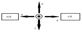전동기의 자장 내에 있는 도체의 전류가 그림과 같이흘러나올 경우 도체가 받는 힘의 방향으로 옳은 것은?