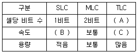 다음은 플래시 메모리의 셀 타입(SLC, MLC, TLC)에 관한 설명이다. 표의 괄호 안에 들어갈 내용으로 옳은 것은?