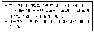 컴퓨터 전원을 켜면 디스크에 저장되어 있는 운영체제를 메모리에 로드한다. 이러한 과정을 부팅이라고 하는데, 부팅 정보를 가지고 있는 디스크 영역을 부트 섹터라고 한다. 다음 설명하는 바이러스 종류는 무엇인가?