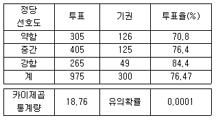 유권자들로부터 정당선호도라는 행변수와 투표여부라는 열변수로 분류하여 얻은 교차표이다. 분석결과에 대한 설명으로 옳지 않은 것은?