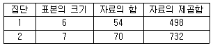 두 집단의 자료를 분석한 결과 다음 표를 얻었다. 두 집단의 분산이 같다고 가정할 때, 두 집단의 공통분산의 추정값은?