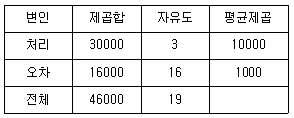 다음 표는 4 개의 처리에 대하여 동일한 반복수로 완전확률화계획법(completely randomized design)으로 얻어진 자료에 대한 분산분석표의 일부이다. 이 때 세 처리에 대한 비교 (contrast)