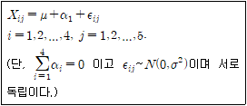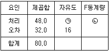 에 대한 분산분석표가 아래와 같을 때, 가설 H0:α1=α2=α3=α4=0 vs H1:not H0 을 검정하기 위해 ㉡에 들어갈 값은?