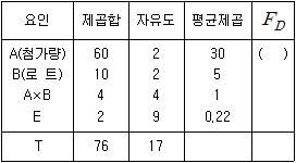 어떤 화학제품의 불순물에 대한 영향을 조사하기 위하여 원료의 모든 로트 B를 랜덤으로 3로트 택하고, 첨가량 A를 A1, A2, A3의 3수준으로 변화시켜, 반복 2회의 3×3×2=18회의 실험 전체를 랜덤화하여 실험한 결과 다음의 분산분석표를 얻었다. ( )에 들어갈 값은? (단, 로트는 랜덤요인임)