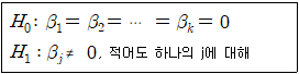 회귀식의 유의성 검정이란 반응변수(종속변수) y와 설명변수 x1, x2, …, xk 중 어느 하나 혹은 그 이상의 것들 사이에 선형관계가 있는지 여부를 확인하는 다음 가설에 대한 검정이다. 적절한 검정방법은?
