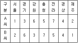 A씨와 B씨에게 선호하는 국내 여행지의 순위를 다음 표와 같이 받았다. 스피어만의 상관계수는?