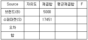 4개 브랜드(B)에 대한 10개 수퍼마켓(S)별 매출액의 차이를 분석하였다. 다음 분산분석표의 값으로 틀린 것은? (단, 전체자료에 대해 평균의 분산은 각각 245900, 17.963 이다.)