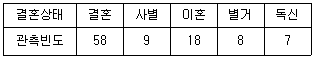 어떤 설문조사에서 50대의 남자 100명에게 현재의 결혼상태를 물어본 결과 다음고 ㅏ같은 표를 얻었다. 50대 남자의 결혼상태의 비율이 모두 동일하다고 할 수 있는지를 유의수준 0.05에서 검정하고자 할 때, 귀무가설과 검정통계량의 값, 그리고 귀무가설 기각여부를 바르게 나타낸 것은? (단, χ24, 0.05 = 9.488, χ25, 0.05 = 11.070)