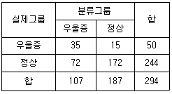 다음은 우울증환자들과 보통사람들 294명의 자료를 기반으로 판별분석모형을 개발하여 구한 분류표이다. 이 판별모형의 정확도와 오분류율을 구하면?