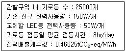A지방자치단체의 관할구역 내에서 연간 350일 점등하고 있는 가로등 전구 모두를 LED등으로 교체하고자 한다. 관련 자료가 아래 조건과 같을 때, 연간 온실 가스 감축량(tCO2-eq)은? (단, 1tCO2-eq 미만 온실가스 감축량은 무시)