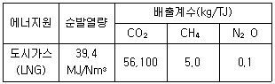 건물업종 관리업체 A에서 1년 간 도시가스(LNG) 58.970Nm3을 사용했을 때 온실가스 배출량은? (단, 발열량과 배출계수는 아래 표 참조, 산화계수는 1.0을 적용)