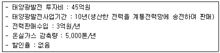 A기업은 배출구너거래제도에 의무적으로 참여해야 하는 기업이며, 10년 동안 매년 5,000톤의 배출권이 필요하다. 만약 A기업이 아래와 같은 태양광발전사업을 통해 연간 5,000톤의 배출권을 확보할 수 있다면, 다음 중 태양광 발전사업의 한계감축비용과 태양광발전이 배출권을 시장에서 구매하는 대안보다 경제적으로 유리할 지 여부를 옳게 짝지은 것은? (단, 시장에서 배출권을 구매할 수 있는 가격은 배출권 1톤당 5만원)