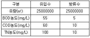 A하수처리장은 메탄올 450톤 회수하여 연료로 사용하였으며(메탄 회수율은 80%), 아래와 같은 조건으로 처리장은 운영한다. 이 때 온실가스 배출량(tCO2-eq)으로 가장 가까운 값은? (단, 온실가스ㆍ에너지 목표관리 운영 등에 관한 지침기준, 회수한 메탄의 고정연소황동 배출량은 제외, CH4 배출계수 0.48 kgCH4/kgBOD, N2O 배출계수 0.005kgN2O-Nkg-T-N, N2O의 분자량 44.013, N2의 분자량 28.013, 슬러지 반출은 없음)