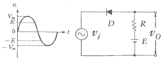 다음 회로에 교류 전압 νi 를 가하면 출력 νo 의 파형은? (단, 0<E<Vm이며, 다이오드의 특성이 이상적일 경우로 가정한다.)