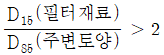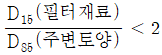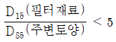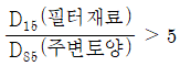 집배수관을 덮는 필터재료가 주변에서 유입된 미립자에 의해 막히지 않도록 하기 위한 조건으로 옳은 것은? (단, D15, D85는 입경누적 곡선에서 통과한 중량의 백분율로 15%, 85%에 상당하는 입경)