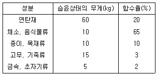 도시의 쓰레기 특성을 조사하기 위하여 시료 100kg에 대한 습윤상태의 무게와 함수율을 측정한 결과가 다음 표와 같을 때 이 시료의 건조중량(kg)은?