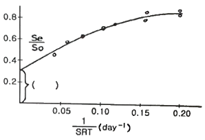 분뇨처리 결과를 나타낸 그래프의 ( )에 들어갈 말로 가장 알맞은 것은? (단, Se : 유출수의 휘발성 고형물질 농도(mg/L), So : 유입수의 휘발성 고형물질 농도(mg/L), SRT : 고형물질의 체류시간)