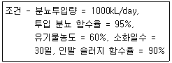 아래와 같은 조건일 때 혐기성 소화조의 용량(m3)은? (단, 유기물량의 50%가 액화 및 가스화된다고 한다. 방식은 2조식이다.)