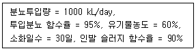 아래와 같은 조건일 때 혐기성 소화주의 용량(m3)은? (단, 유기물량의 50%가 액화 및 가스화된다고 한다. 방식은 2조식이다.)