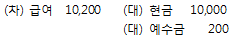 이번 달 종업원 급여 ₩10,000을 지급하면서 소득세 ₩200을 차감한 잔액은 현금으로 지급하다. 이 거래에 대한 분개로 옳은 것은?