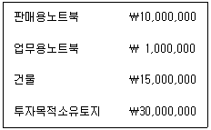 다음은 노트북 판매 대리점을 운영하고 있는 상공의 자산내역 일부이다. 재고자산의 합계금액을 계산하시오.