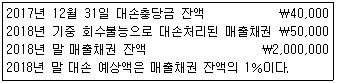 다음은 (주)대한상사의 매출채권과 관련된 자료이다. 2018년 12월 31일 결산 결과 포괄손익계산서에 계상될 대손상각비의 금액으로 옳은 것은?