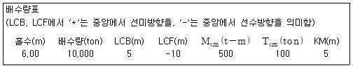 선수미 흘수가 각각 6m인 선박에서 선수평형수탱크의 평형수 100ton을 선미평형수탱크로 100m 이동하였을 경우에 트림, 선수 및 선미 흘수는? (단, LBP는 100m이고, 배수량표는 다음과 같다.)
