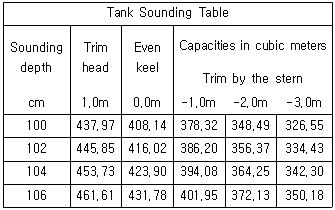 선박의 No.3 FOT(C)의 검량을 위해 힐(Heel) 수정 테이블을 이용해 보정한 Sounding depth(m)는 1.03 m이다. 아래 Tank sounding table을 이용하여 트림을 보정한 유류의 양(m3)은? (단, 선박의 선수흘수는 7 m, 선미흘수는 8 m이다.)