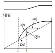 병목흐름(Bottleneck flow)인 상태에서의 도착 차량수와 출발차량수를 누적하여 나타낸 아래의 시간-차량 누적 곡선에 대한 설명이 틀린 것은?