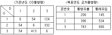기준년도 OD 통행량과 목표연도의 교차통행량이 아래와 같을 때, 초기과정(k=0)에서 구한 존 별 유출량과 유입량의 성장인자를 이용하여 산출한 1차 반복과정(k=0)의 평균성장 인자값이 틀린 것은?
