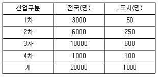 산업별 종사자수가 아래와 같을 때, 입지계수에 의한 J도시의 기반 산업은?