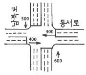 다음 그림과 같이 좌우회전이 허용되지 않은 간단한 2현시 교차로의 접근교통량에서 동서로와 남북로 간 유효녹색 시간의 배분은?